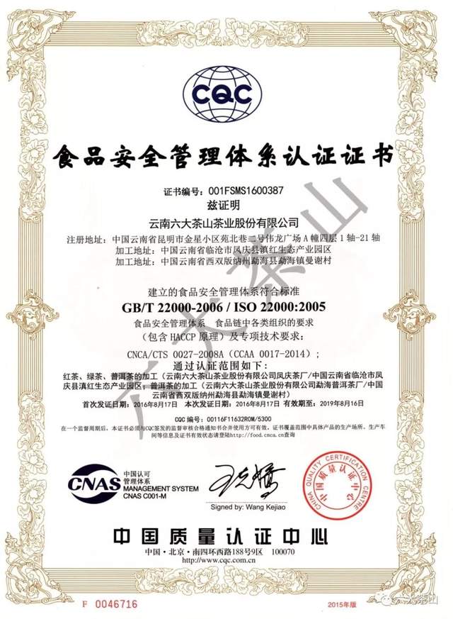 歷年來,六大茶山公司獲得國家有機食品認證,通過SC認證、食品出口衛(wèi)生注冊登記,云南省10大名品、云南省老字號、有機產(chǎn)品認證企業(yè)、出口食品生產(chǎn)企業(yè)、中國茶葉行業(yè)百強企業(yè)、云南首批年份普洱茶質(zhì)量保薦溯源企業(yè)、云南首款曬青茶質(zhì)量保薦溯源企業(yè)、HACCP體系認證企業(yè),通過ISO9001質(zhì)量管理體系認證,ISO22000食品安全管理體系認證。